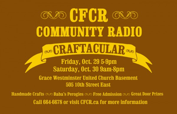 “Fall has fell here in Saskatoon, and with the new season comes great new events being put on by your community radio station! We’re really excited to present to you the very first CFCR Community Radio Craftacular, taking place October 29th & 30th at Grace Westminster United Church basement. What the devil is a “Craftacular,” you ask? Well, we wanted to highlight all the great crafters and artisans from right here in Saskatoon and area, so we thought we’d get a bunch of them together in a sort of alternative craft fair. You’ll find all sorts of goodies, from jewelry to ceramics to knitting to books to framed art to knicks, knacks and paddy whacks. It will be a great one-stop for all your early holiday shopping. And, since it’s in a church basement, we thought what better food to serve than perogies from the fine folks at local Saskatoon perogy maker Baba’s? You’ll surely smell the delicious sauteed onions as soon as you come down the stairs, so be sure to get yourself a plate. There will also be beverages, muffins from Earthbound Bakery and other delicious desserts available. The whole thing starts on Friday, October 29th from 5-9pm and picks up again on Saturday the 30th, from 9am-8pm, closing early enough for all the kids to go trick-or-treating! Admission is FREE and there will be door prizes and a 50/50 draw, so you might come out ahead just for attending! Vendor space is almost full, but if you are interested in participating as a seller, email our Program Director, Jay Allen at [email protected] for more information.”