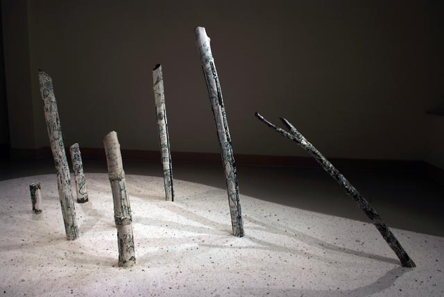 Her sculpture, consisting of a series of porcelain tree trunks resonant of birch trees, includes a seven-foot tall, forked tree sitting in the centre of her Donors Forest. The tree mimics the Y-shaped wooden columns in the Memorial Centre’s Sacred Space. “For my Donors’ Forest, I chose to work in the tradition of the commemorative tree. The inscriptions on the trees’ surface commemorate the soldiers, poets, politicians, and the cultural diversity of the Canadians buried at the Beechwood Cemetery,” Nickel said in her artist’s statement. The piece simultaneously exudes a warmth that the viewer finds inviting, a place, perhaps, to find solace. But the austerity of subject ultimately interrupts the onlooker’s reverie, forcing her to reflect on a different set of emotions. “The commissioned piece recognized the generosity of donors who made the new Memorial Centre possible, but for me it also had to commemorate the contribution of people who have gone before us. I’d say what was most poignant for me was the recognition of the young soldiers in the military cemetery.” Images of monuments in the cemetery have been transferred onto the tree. Nickel inscribed lines from a poem by Archibald Lampman, a quote from Tommy Douglas’s epitaph: “Courage my friends, ‘tis not too late to make a better world,” and excerpts from John McCrae’s In Flanders Fields, in English and French. There is also an image of the entrance marker to the Chinese section of the cemetery as well as leaves and other plant matter Nickel collected on the cemetery grounds embedded in the porcelain; the organic matter burned off in the kiln-firing, but its impressions remain.via link