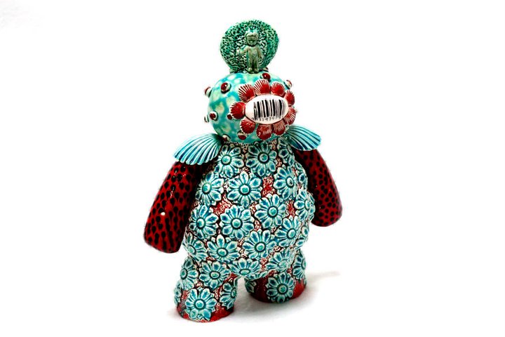 “I handbuild usually, in a pile-it-on, hollow-it-out method. I use varying surface techniques, anything from cold finishing with bondo and acrylic to multiple firings with underglazes and lusters.